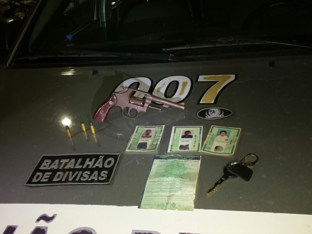 Na noite do mesmo dia (28), os Policiais do Batalhão de Divisas de serviço em Crato/CE, durante patrulhamento na cidade, abordaram 04 indivíduos em atitude suspeita, foi feita a abordagem e com um dos acusados estava 01 revolver, cal. 32, nº 2175, com 03 munições (uma delas deflagrada); como também, um veículo honda/, que os mesmos afirmam terem roubado; na ocasião foram abordados: André Luiz Cezário Fernandes; Paulo Cesar da Silva Santos; Paulo Henrique dos santos e Gabriel ; os acusados afirmaram que compraram o revolver com o intuito de praticar roubos e, a motocicleta teria sido roubada m Nova Olinda; todos foram conduzidos a Delegacia Regional do Crato, onde os infratores com mais de 18 anos foram autuados nos artigos 14 do estatuto do desarmamento e 288 CPB. Já o adolescente foi indiciado por ato infracional análogo aos artigos 14 do estatuto do desarmamento, 288 do CPB e 244, b, ECA.