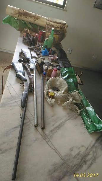 No local, a Polícia Militar encontrou duas espingardas de fabricação caseira, quatro recipientes com espoletas e 32 cartuchos de diferentes calibres. Além disso, foram encontrados 2,600kg de chumbo, 320 gramas de pólvora e 250 gramas de sementes de maconha. Todo o material estava enterrado no quintal da residência. Durante a ação policial foi constatado que a senhora em referência é mãe de Cícero da Silva Sousa, conhecido como “Cícero de Lalá”, que foi preso no dia anterior pelo crime de tráfico de drogas naquela cidade.