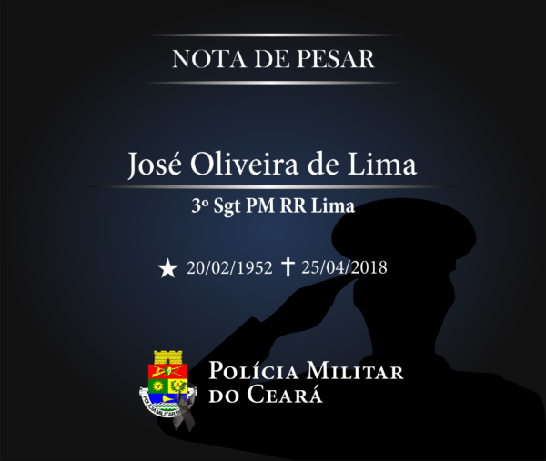 O Comando Geral da Polícia Militar do Ceará (PMCE), informa, com pesar, o falecimento do 3° Sargento PM José Oliveira de Lima, lotado no Batalhão de Segurança Patrimonial (BSP), fato ocorrido nesta quarta-feira, 25 de abril.