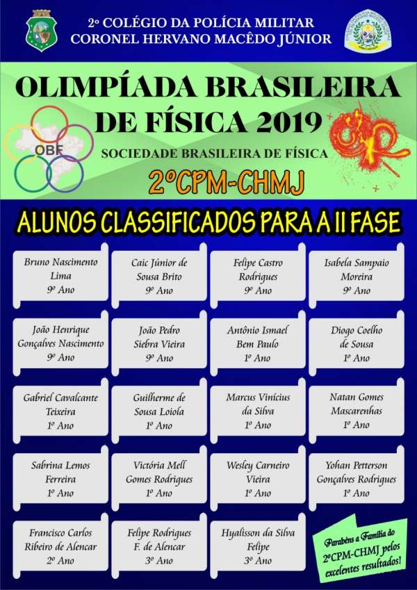 Alunos do 2º Colégio da Polícia Militar do Ceará, Coronel Hervano Macêdo Júnior, sediado em Juazeiro do Norte/CE, se destacaram na Olimpíada Brasileira de Física 2019, organizada pela Sociedade Brasileira de Física.