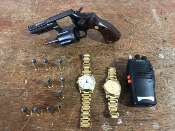 Os militares realizaram a abordagem e com ele foi encontrado um revólver calibre .38, munições, rádio comunicador e alguns relógios. O suspeito ainda estava usando uma blusa com identificação da Polícia Civil.