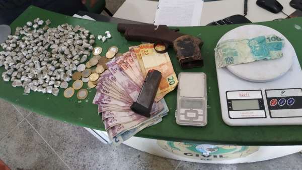 Ao fazer incursão em um beco, a composição se deparou com dois indivíduos com atitudes suspeitas, momento em que foi realizada a devida busca pessoal. Durante a ação, foi realizado o levantamento acerca da ficha criminal dos suspeitos, onde foi constatado que Antônio Adailton da Silva Sousa (28) já tinha antecedentes criminais, assim como Fabrício Pereira de Sousa (26) que, também, possuía mandado de prisão em aberto por porte ilegal de arma de fogo, receptação e tráfico de drogas. Após os fatos, eles autorizaram a entrada dos PMs nas suas residências, onde foi encontrado o seguinte material: uma pistola artesanal calibre .28, com capacidade para 1 munição, sem marca/numeração aparente; um carregador de pistola PT 640, sem munição; 190 balinhas de maconha (equivalente a 140 gramas); quatro petecas de cocaína; duas balanças de precisão; material para embalar as drogas e R$ 266,75 em espécie.