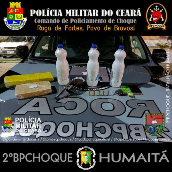 Uma composição da 4ª Companhia do 2º Batalhão de Policiamento de Choque (ROCA) da Polícia Miliar do Ceará (PMCE) prendeu, na noite de ontem, 17, José Hamilton Lima do Nascimento, 35, e Lucas Rafael Souza do Nascimento, 19, no bairro José Walter, em Fortaleza-CE. Com eles, além de um revólver, também foram apreendidas drogas e dinheiro.
