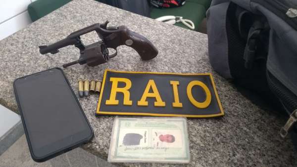 Rapidamente, os policiais foram ao local da denúncia e encontraram o suspeito dentro do banheiro da casa. Durante a busca pessoal foi encontrada, dentro da mochila que carregava, a arma e um celular que havia sido roubado.