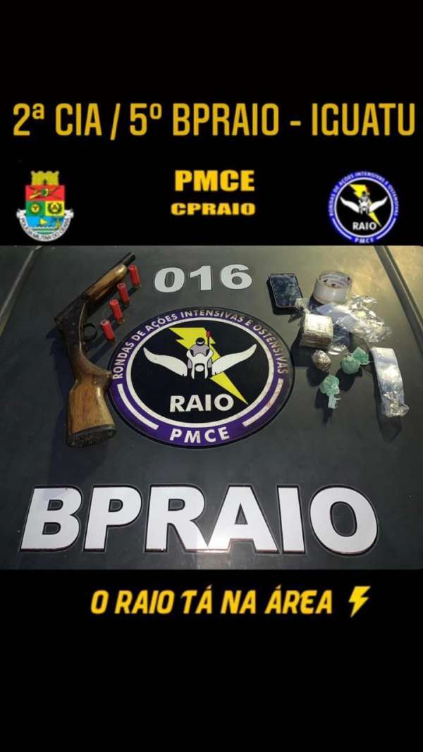 A Polícia Militar do Ceará (PMCE), por meio de uma composição do Comando de Policiamento de Rondas e Ações Intensivas e Ostensivas (CPRaio) apreendeu uma espingarda calibre 12 e 150g de maconha na tarde de ontem, 14, em Iguatu-CE.