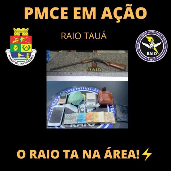 A Polícia Militar do Ceará (PMCE), por meio de equipes do Comando de Policiamento de Rondas e Ações Intensivas e Ostensivas (CPRaio), efetuou na manhã de ontem, 13, a prisão de Antônio Oliveira Baía, 32, Marcos Wylle Pereira, 28, e José Lopes Monteiro, 37, em Tauá-CE. Na ocorrência, foram apreendidas uma espingarda calibre .32, quatro munições de mesmo calibre e 169g de cocaína.