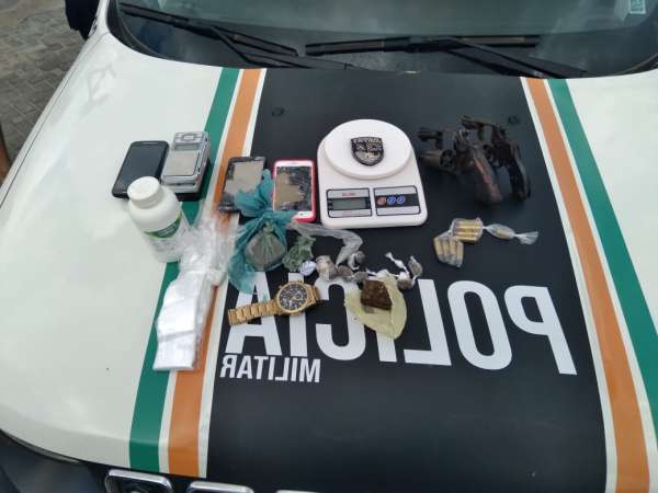 Composições da 3ª Companhia do 11º Batalhão efetuaram a prisão de Maria Luana de Barros, 24, de Rubens Xavier Duarte, 19, e de Francisco Eurivan Vieira Filho, 19, e a apreensão de um adolescente depois de um roubo no município cearense de Cruz. Com o grupo, os policiais militares apreenderam dois revólveres calibre .38, cinco munições, dois tabletes e 12 trouxinhas de maconha, quatro trouxinhas de cocaína, duas balanças de precisão, uma máquina de cartão de crédito, dois celulares roubados, saquinhos para embalar drogas e R$ 434,85 reais em moedas e R$ 7,00 reais em papel-moeda. O fato aconteceu no domingo, 17, depois de que recebeu informações sobre os suspeitos.