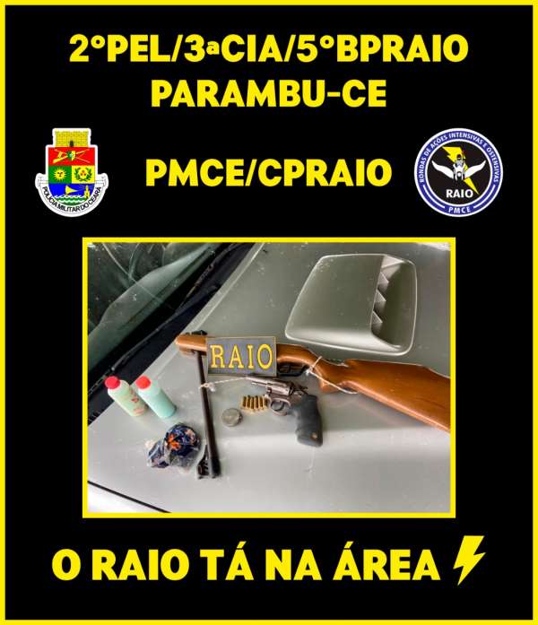 Na manhã de hoje, 30, uma equipe do Comando de Policiamento de Rondas e Ações Intensivas e Ostensivas (CPRaio) da Polícia Militar do Ceará (PMCE) prendeu José Nilson Noronha Mota, 35, com quem apreendeu uma espingarda de pressão adaptada para calibre .22, um revólver calibre .38, munições e insumos de pólvora, chumbo e espoleta no município cearense de Parambu.