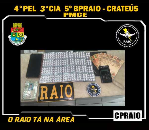Francisco Cleuson Moreira, 34, foi preso por uma equipe do Comando de Policiamento de Rondas e Ações Intensivas e Ostensivas (CPRaio), da Polícia Militar do Ceará (PMCE), na noite de quinta-feira, 04, em Crateús-CE. Com ele foram apreendidos 420 comprimidos de anfetamina e R$ 290,00 em espécie.
