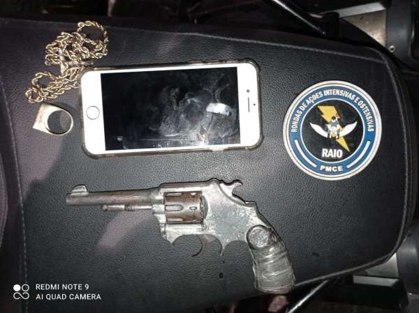 Uma equipe do Comando de Policiamento de Rondas e Ações Intensivas e Ostensivas (CPRaio), da Polícia Militar do Ceará (PMCE), apreendeu um adolescente na tarde da última quinta-feira, no bairro Vicente Pinzón, em Fortaleza-CE. Com ele, foi encontrado um revólver calibre .22 e recuperado um carro e uma bolsa contendo uma carteira com documentos e cartões diversos, um aparelho celular, um anel e um cordão, os quais tinham sido roubados de duas vítimas.