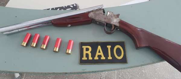 Com essas informações, os policiais foram verificar a denúncia. Após chegarem ao local comprovaram o fato, pois encontraram o suspeito na porta de sua residência, vindo o mesmo a confessar que tinha uma arma e munições dentro de casa, revelando em seguida a localização da mesma – estaria no guarda roupa que se encontrava no seu quarto. O material sendo – uma espingarda cal. 12, artesanal, sem numeração e cinco munições cal. 12 intactas – foi encontrado e apreendido.