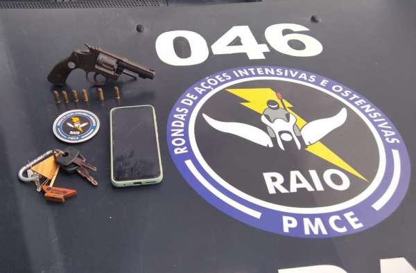 No interior do veículo no qual ele estava, o revólver calibre .32 com seis munições intactas e também a quantia de R$1.150,00 em espécie foram apreendidos.