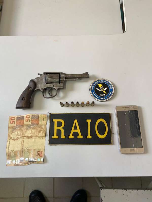 Uma composição do Comando de Policiamento de Rondas e Ações Intensivas e Ostensivas (CPRaio) da Polícia Militar do Ceará (PMCE) prendeu Raimundo Correia da Silva Junior, 34, na manhã deste domingo, 14, no município cearense de Carnaubal. Com ele, um revólver calibre .38 com sete munições intactas, três gramas de maconha e R$101,00 em espécie foram apreendidos.