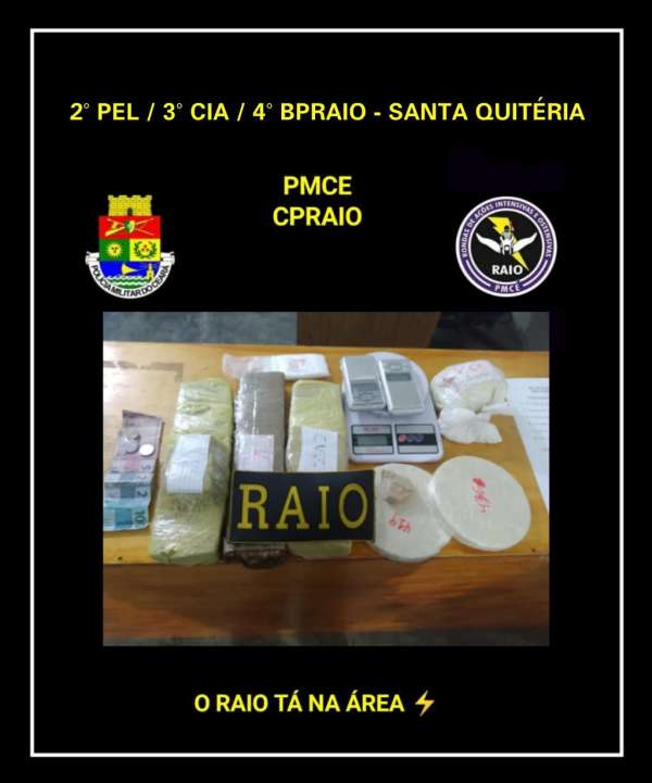 Nesta terça-feira (08), Shirley da Silva de Castro (21) foi presa por uma composição do Comando de Policiamento de Rondas de Ações Intensivas e Ostensivas (CPRaio), da Polícia Militar do Ceará (PMCE). A ocorrência foi em Santa Quitéria-CE e resultou na apreensão de 2,897 quilos de maconha, 850 gramas de crack, 567 gramas de cocaína, R$110,60 em espécie e material para o tráfico de drogas.