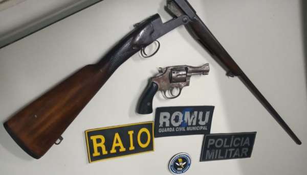 Os agentes de segurança foram até o local e constataram a veracidade da denúncia, apreendendo uma espingarda do tipo cartucheira calibre .36, escondida atrás do guarda-roupas, e um revólver calibre .38, ao lado da cama e dentro de uma caixa de sapato.