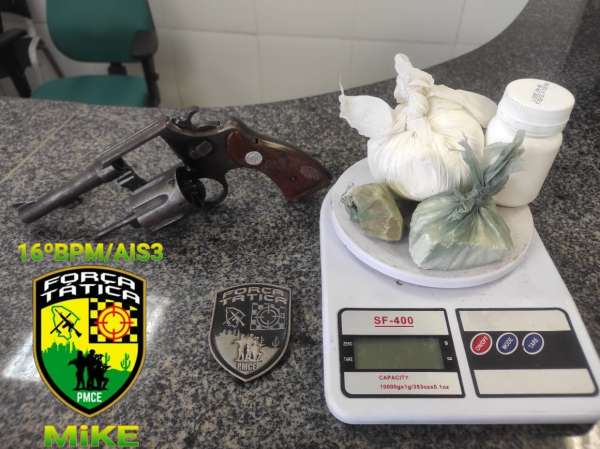 PMCE apreende arma de fogo e drogas no bairro Ancuri