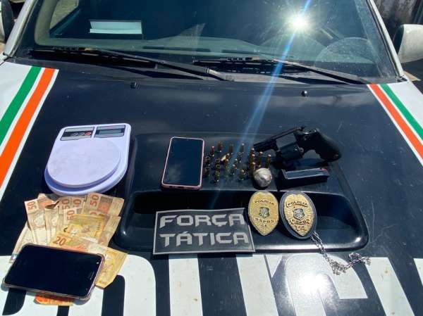Uma ação policial do 12º Batalhão da Polícia Militar do Ceará (PMCE) resultou na apreensão de um revólver calibre .38 com cinco munições, 14 munições de .380 e três cápsulas de .9mm, 14 gramas de maconha, uma balança de precisão, R$ 580,00 em espécie, três aparelhos celulares, uma motocicleta e uma bandoleira. Os objetos foram encontrados com Francisco Alex Martins Sampaio (23) e um jovem de 17 anos. A ocorrência que aconteceu na última quinta-feira, 17, em Caucaia-CE, na Região Metropolitana de Fortaleza.