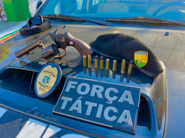 Policiais militares do 12º Batalhão da Policia Militar do Ceará (PMCE), em Caucaia, apreenderam um revólver calibre 38 com oito munições intactas, enrolado em um pano e escondido em um terreno residencial. O fato aconteceu na tarde de hoje, 25, em uma casa localizada na Rua João Moreira, bairro Sítios Novos.