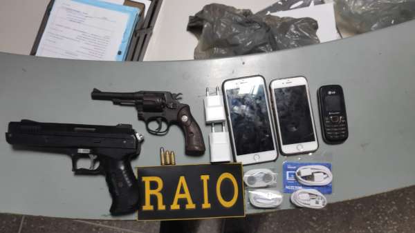 Douglas Pereira da Silva (23) foi localizado em casa pelos agentes do CPRaio. Aos policiais, ele informou que as armas estavam com o terceiro suspeito, o adolescente. Quando se dirigiram à residência do jovem, os militares localizaram, em um mato atrás da casa dele, uma sacola na qual continha o simulacro e o revólver.