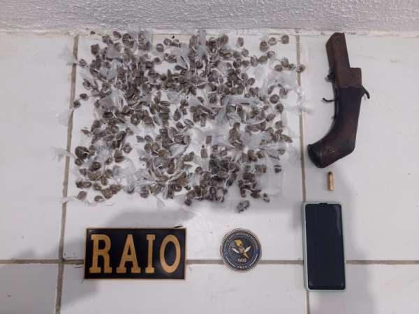 Os raianos foram até o local informado e foram recebidos por Granvile da Rocha, que falou que o apartamento era alugado. Entretanto, o suspeito confessou a existência de drogas (249 gramas de maconha em trouxinhas), uma munição intacta calibre .38 e uma armação de uma arma de fogo artesanal, que foram apreendidos.