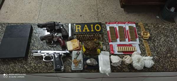 Com os suspeitos foi apreendida uma mochila com uma pistola calibre .765, um revólver calibre .38, um revólver calibre .32, 90 munições, uma balança, uma corrente, um relógio, sacos plásticos, pendrive, papel seda, dois aparelhos celulares, um videogame playstation 2, 142 gramas de maconha, 29 gramas de cocaína, 140 gramas de crack.