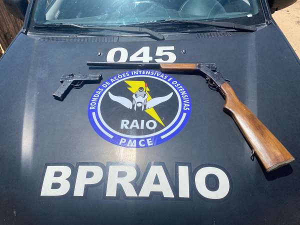 Uma equipe do Comando de Policiamento de Rondas de Ações Intensivas e Ostensivas (CPRAIO), da Polícia Militar do Ceará (PMCE), apreendeu uma pistola artesanal do tipo socadeira e uma espingarda também artesanal, depois de uma denúncia. O fato aconteceu nesta quinta-feira (02), no município cearense de Madalena.