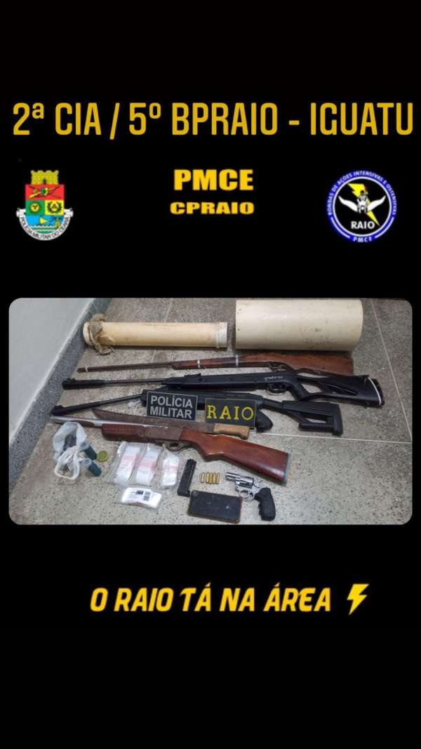 Uma operação de equipes do 10º Batalhão Policial Militar (10º BPM) e do Comando de Policiamento de Rondas de Ações Intensivas e Ostensivas (CPRAIO) resultou na apreensão de duas espingardas artesanais, duas espingardas de pressão, um revólver de calibre .38, um carregador de pistola .40, recipientes contendo espoletas, chumbo, pólvora e chumbinho, um facão, diversos sacos plásticos, um aparelho celular e um tubo de spray antiferrugem. A ação policial, ocorrida nessa sexta-feira (03) em Várzea Alegre-CE, resultou na prisão de Luiz Carlos Bezerra da Costa, 37, e de Francisco Alves da Costa Junior, 29.