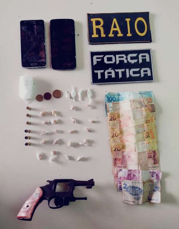 A Polícia Militar do Ceará (PMCE) efetuou a prisão de dois adultos e a apreensão de dois adolescentes, nesta sexta-feira (10), por porte ilegal de arma de fogo e tráfico de drogas em Aracati-CE. Com o grupo foi apreendido um revólver calibre 32 municiado, 21 pedras de crack, quatro trouxinhas de Cocaína, munições, R$ 277,40 em espécie, embalagens plásticas para embalo da droga e aparelhos celulares.