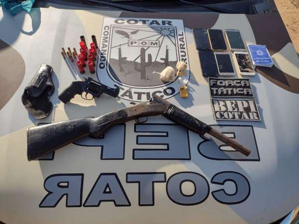 Dois homens foram presos pela Polícia Militar do Ceará (PMCE), por meio do Comando Tático Rural (Cotar) com o apoio da Força Tática de Limoeiro do Norte, na manhã desta terça-feira (21), na localidade de Pau Furado, em Tabuleiro do Norte-CE. Com eles, foi apreendido um revólver calibre 38, uma espingarda calibre 12, munições, uma motocicleta sem placa, seis aparelhos celulares e 65,2 gramas de crack.