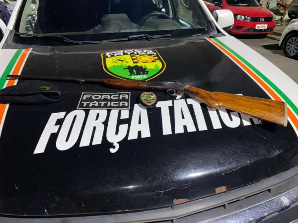Uma equipe de Força Tática, ao saber da suspeita, foi até o local apontado conferir as informações. Chegando no lugar apontado, no bairro São Gerardo, rua Alto da Paz, o indivíduo foi localizado e revistado. Foi conferido que contra ele havia o mandando de prisão em aberto pelo crime de homicídio e, na revista no lugar, foi encontrado um rifle calibre .44.