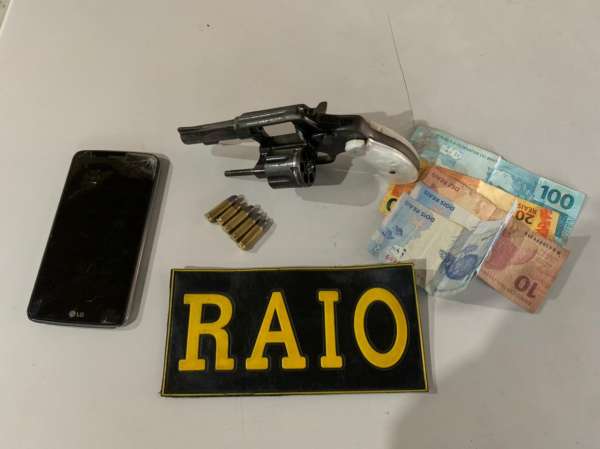 Durante varredura no perímetro da abordagem foi localizado próximo ao suspeito, em um terreno baldio, um revólver calibre .32 com seis munições intactas, que o suspeito confessou ser seu.