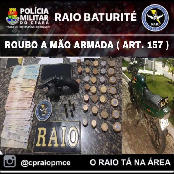 A Polícia Militar do Ceará (PMCE) prendeu, na tarde dessa sexta-feira (19), Antônio Felipe Duarte da Silva, 18 e Gilmar Lima Gadelha, 25, por roubo na cidade de Baturité. Aparelho celular da vítima foi recuperado e uma motocicleta e revólver foram apreendidos na ação.
