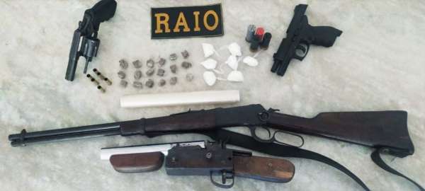 No local, foram apreendidos 64 gramas de cocaína e 26 gramas de maconha, além de uma espingarda artesanal calibre .12, um rifle calibre .38 e um simulacro de pistola.