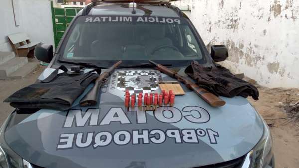 De imediato, a equipe se deslocou ao endereço apontado e após buscas na área foi encontrado um colete balístico, duas espingardas calibre .12, seis munições calibre .40 intactas e 29 munições intactas calibre .12. Nenhum suspeito foi localizado na ação.