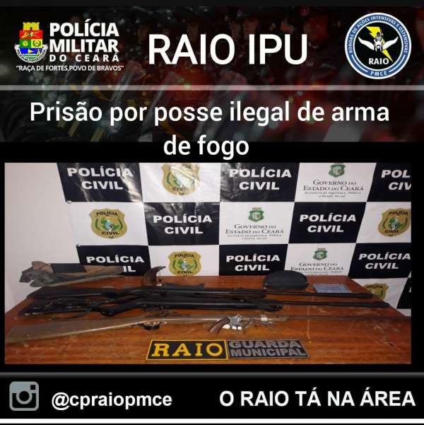 A Polícia Militar do Ceará (PMCE) prendeu um indivíduo com um revólver calibre 22, uma espingarda socadeira e outras duas de pressão, na manhã desta quarta-feira (15), em Ipu-CE. A prisão foi efetuada, por agentes do Comando de Policiamento de Rondas e Ações Intensivas e Ostensivas (CPRAIO).