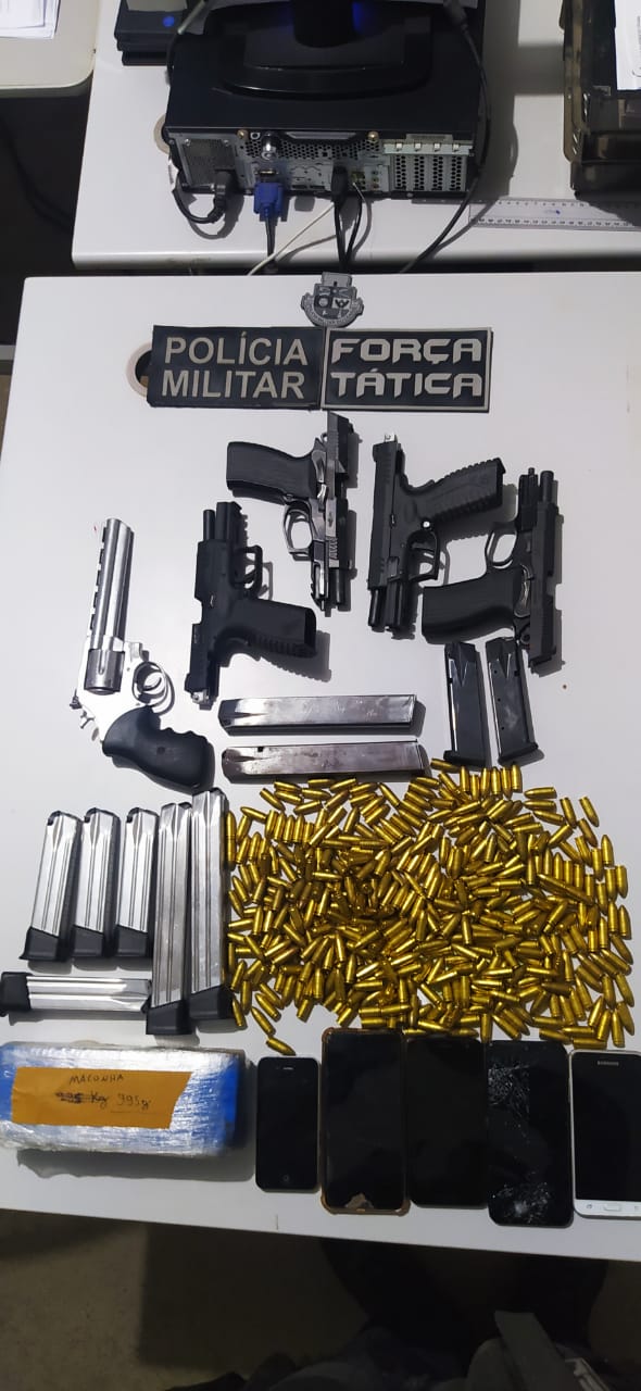 Uma operação da Polícia Militar do Ceará (PMCE) resultou na apreensão de um revólver de calibre .38, quatro pistolas 9mm, dez carregadores 9mm, sendo quatro alongados e seis normais, um quilo de maconha, um pequeno pote repleto de moedas e uma grande quantidade de munições, sendo 395 de calibre 9mm e 20 de calibre .38. Na ocorrência a qual foi registrada na última quarta-feira (29), no município cearense de Varjota, houve a captura de quatro indivíduos suspeitos – dentre os quais dois foragidos da Justiça.
