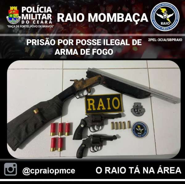 A Polícia Militar do Ceará (PMCE) prendeu um indivíduo com uma espingarda calibre 12, um revólver calibre 38 e um revólver calibre 32, na noite dessa terça (11), em Mombaça-CE. A prisão foi efetuada por agentes do Comando de Policiamento de Rondas e Ações Intensivas e Ostensivas (CPRAIO).