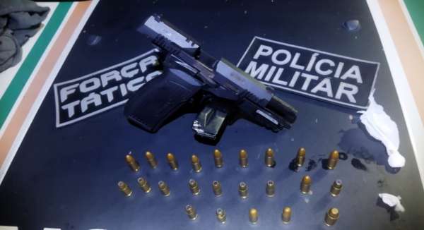 Os militares solicitaram apoio e conseguiram localizar e capturar o adolescente pelos becos da comunidade. Foi apreendido com ele uma pistola calibre 9mm, nove munições calibre 9mm, 13 munições calibre .380, uma munição calibre .40, duas trouxas de cocaína (1,4 gramas), um aparelho celular e uma bolsa.