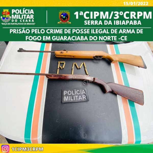 A Polícia Militar do Ceará (PMCE) prendeu, na manhã deste sábado (15), Ricardo Oliveira Neto, 65, por posse ilegal de arma de fogo. O fato aconteceu no sítio Limoeiro, na cidade de Guaraciaba do Norte, após denúncia de disparos. Foi apreendida na ação uma espingarda calibre .36, uma espingarda de pressão e munições.