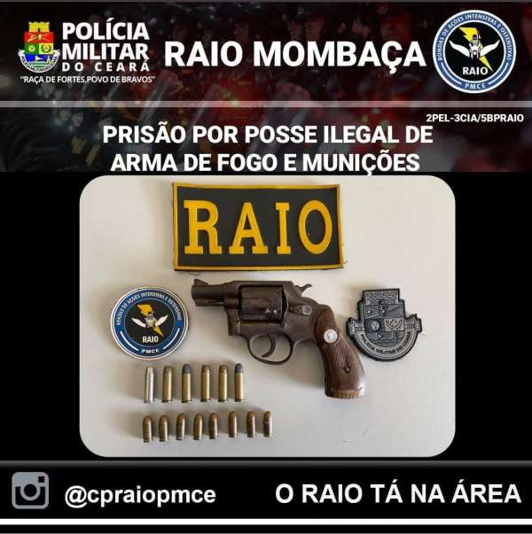 A Polícia Militar do Ceará (PMCE) prendeu um indivíduo por posse ilegal de um revólver calibre 38, nessa segunda-feira (24), em Senador Pompeu-CE. A captura foi efetuada por agentes do Comando de Policiamento de Rondas e Ações Intensivas e Ostensivas (CPRAIO).