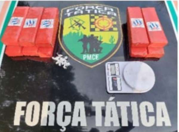 A Polícia Militar do Ceará (PMCE) apreendeu 7,5 quilos de maconha, divididos em dez tabletes, 15 trouxinhas de cocaína, uma balança digital e R$ 68,00 em espécie. O material foi encontrado próximo a Cosmo Batista Correia Filho, 21, nesse domingo (30), em Eusébio-CE.