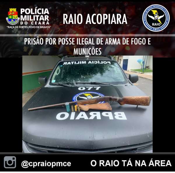 Uma espingarda foi apreendida na residência de Francisco Neves da Cruz Filho, 46, em Acopiara-CE. O suspeito foi preso em flagrante nessa quarta-feira (09), pela Polícia Militar do Ceará (PMCE).