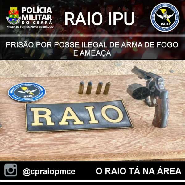 Em Pires Ferreira-CE, nesta quarta-feira (16), uma equipe do Comando de Policiamento de Rondas de Ações Intensivas e Ostensivas (CPRAIO) efetuou a prisão de Antônio Araújo de Sousa, 48. Na casa dele os policiais apreenderam um revólver de calibre .38 com quatro munições intactas.