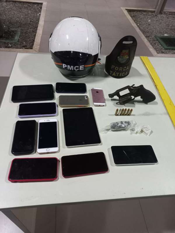 Com ele, a PMCE apreendeu um revólver calibre 38 e uma bolsa com os 12 aparelhos eletrônicos subtraídos, além de algumas gramas de maconha.