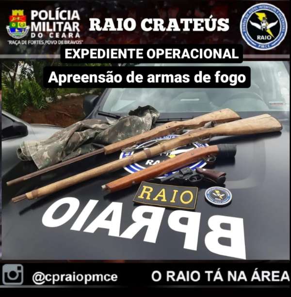 Nesta segunda-feira (28), a Polícia Militar do Ceará (PMCE) apreendeu duas espingardas, uma garrucha e um revólver durante a “Operação Expediente Operacional”. As ações ostensivas e preventivas foram desempenhadas pelo Comando de Policiamento de Rondas de Ações Intensivas e ostensivas (CPRAIO) em Crateús-CE.