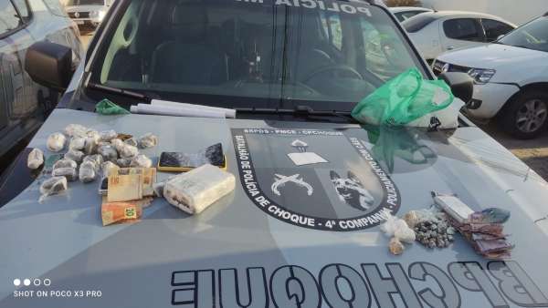 Uma patrulha do Policiamento com Cães (CPCães), do Comando de Policiamento de Choque (CPChoque) da Polícia Militar do Ceará (PMCE), apreendeu 909 gramas de maconha, 39 gramas de crack, 22 gramas de cocaína, R$ 400,65 em espécie, duas balanças de precisão e material para embalar a droga. O fato, que ocorreu nesta sexta-feira (04), em Caucaia-CE, resultou na prisão de dois indivíduos.