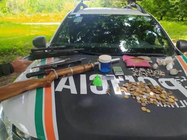 Então, no quintal da residência, escondidas entre tijolos, uma espingarda artesanal calibre 12 e uma garruncha foram apreendidas. Ainda, um balde plástico pequeno contendo uma balança de precisão e algumas pedras de crack foram localizados ali, bem como um pacote contendo maconha, papelotes de cocaína, crack, lâminas de gilete e R$ 57,70 em espécie.
