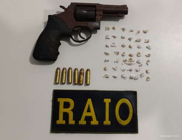Consultado a identificação no sistema policial, foi verificado que o mesmo já tem passagens pela polícia por porte ilegal de arma de fogo e tráfico de drogas, e, após indagações, o mesmo confessou que, em um terreno baldio nas proximidades, havia ocultado um revólver calibre .38 com seis munições intactas e 45 trouxinhas de crack, equivalendo a cinco gramas.
