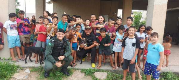 Dezenas de olhinhos infantis, os quais brilharam atentos demonstrando interesse por cada comando executado pelos cães policiais Ikkie (Buldogue francês), Black (Pastor Alemão) e Ajax (Pastor belga de malinois), participaram da apresentação, que foi comandada pelo 1º Ten Jacó, do Batalhão de Policiamento de Prevenção Especializada (BPEsp), e que aconteceu próximo à Base Móvel da PMCE no residencial José Euclides.