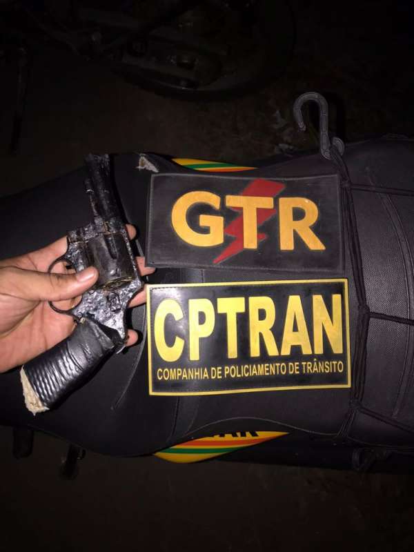 Ao serem abordados, foi constatado que a motocicleta apresentava queixa de roubo. Na busca pessoal, foi encontrado, na cintura do garupeiro, um revólver calibre 38.